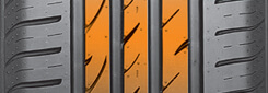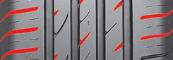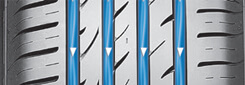 Desenin orta kısmında sürekli temas halinde üç şerit bulunur; bu, düz ilerlemede stabiliteyi korumaya ve direksiyon tepkisini iyileştirmeye yardımcı olur.