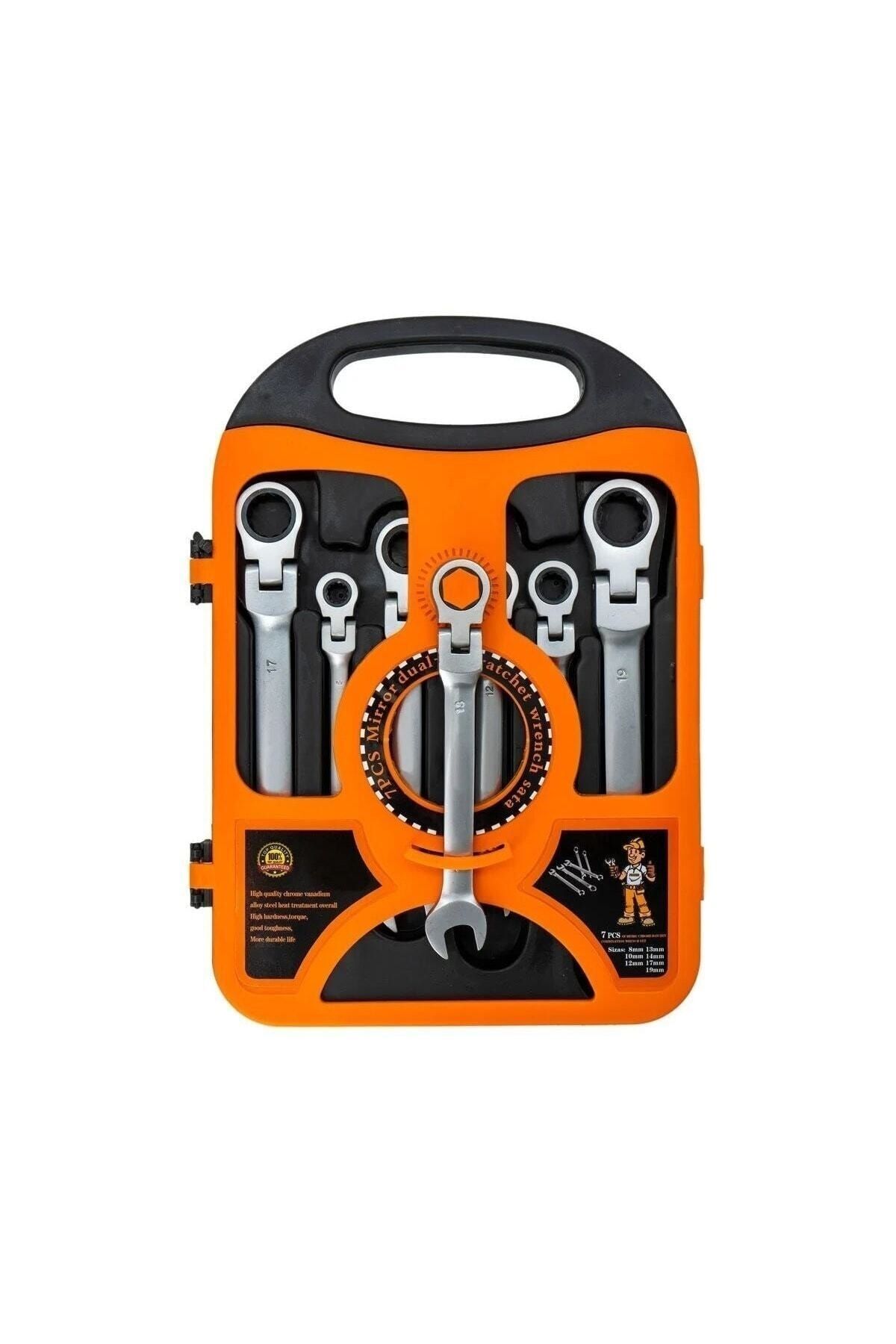 7 parçadan oluşan mafsallı cırcır kombine anahtar takımıdır. ; Anahtar ölçüleri: 8,10,12,13,14,17,19 mm ; Malzeme: Cr-V ; Krom kaplama, mat kaplama ; Plastik taşıma çantası ;